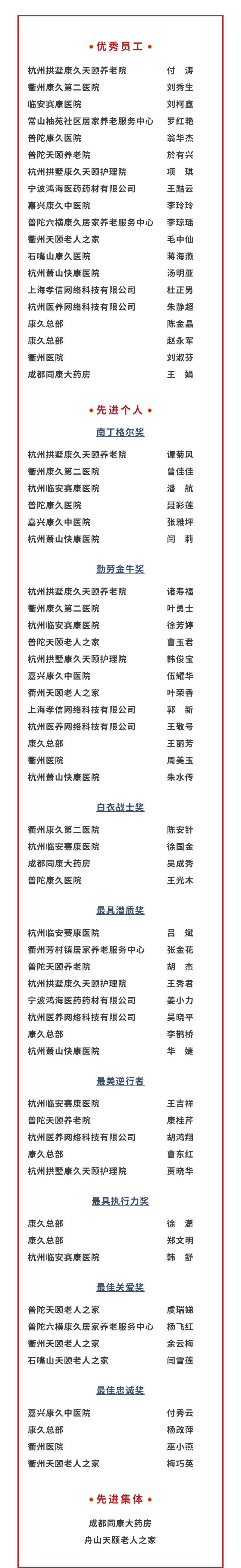 2021年,這些獲獎員工在各自崗位上兢兢業(yè)業(yè),努力奉獻(xiàn),為全體員工樹立了榜樣,也對集團(tuán)營收及利潤的持續(xù)增長提供了有力的支撐,讓康久集團(tuán)在康養(yǎng)產(chǎn)業(yè)的創(chuàng)新生命力更加強(qiáng)大。